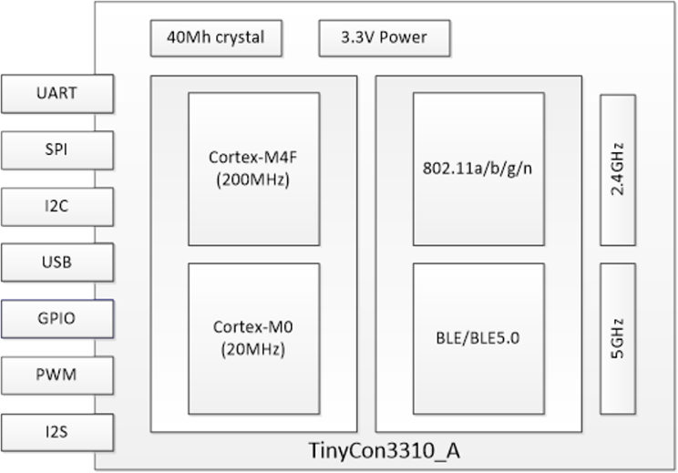TinyCon3110是一款基于SoC方案WiFi/BLE/BLE5.0芯片設(shè)計(jì)的WiFi模塊,既能夠提供了便捷的網(wǎng)絡(luò)接入功能,同時也能夠提供了強(qiáng)大的控制功能。它包含一個ARM Cortex KM4的MCU,一個KM0的MCU,支持802.11b/g/n 1T1R的射頻,提供大量的外設(shè)接口,可以讓您的開發(fā)更靈活。芯片支持外置大功率PA,發(fā)射功率可達(dá)23dbm。TinyCon3110是一個完整的WiFi解決方案,可以獨(dú)立運(yùn)行完成接入網(wǎng)絡(luò)、控制單元;也可以作為slave搭載在其他host端完成所有操作。